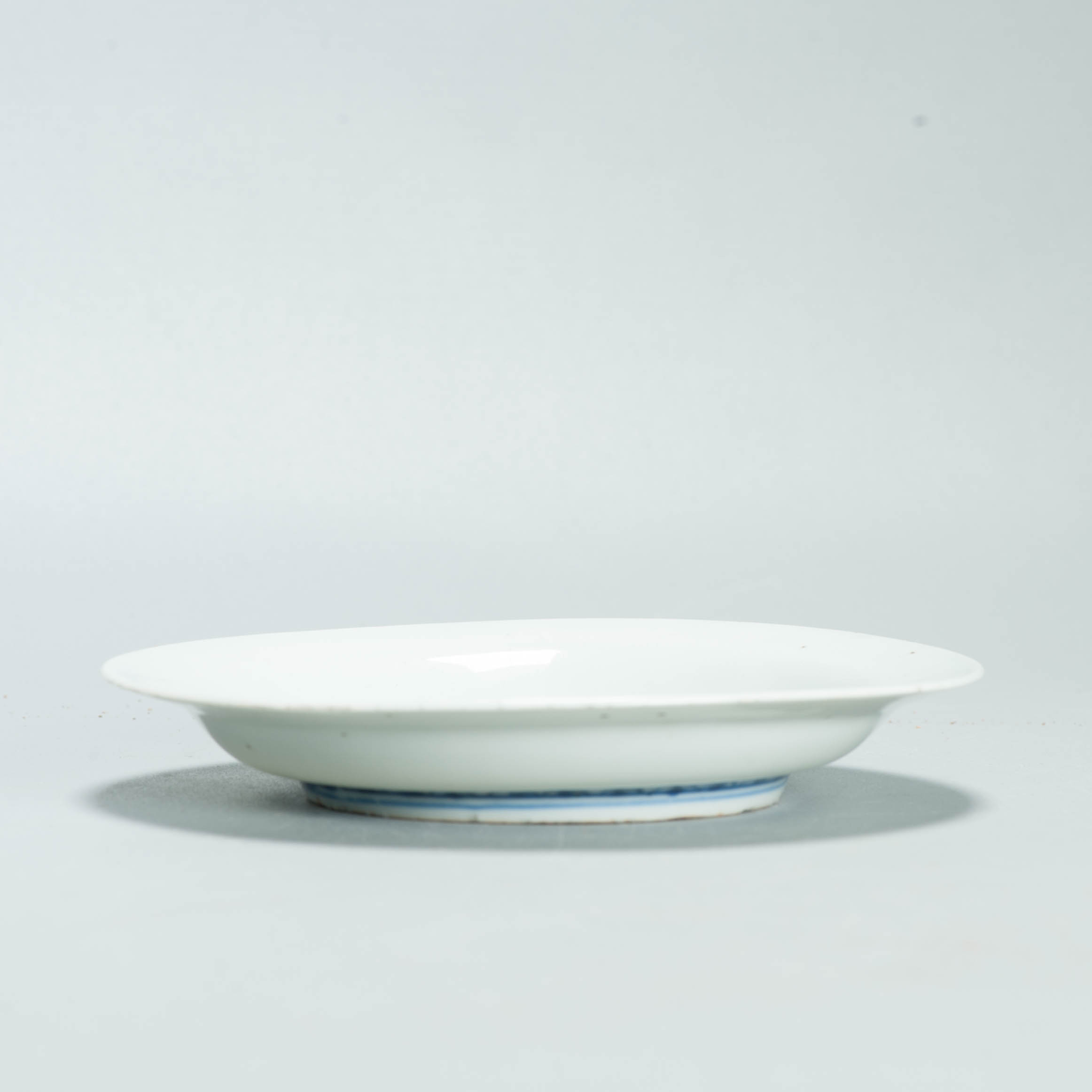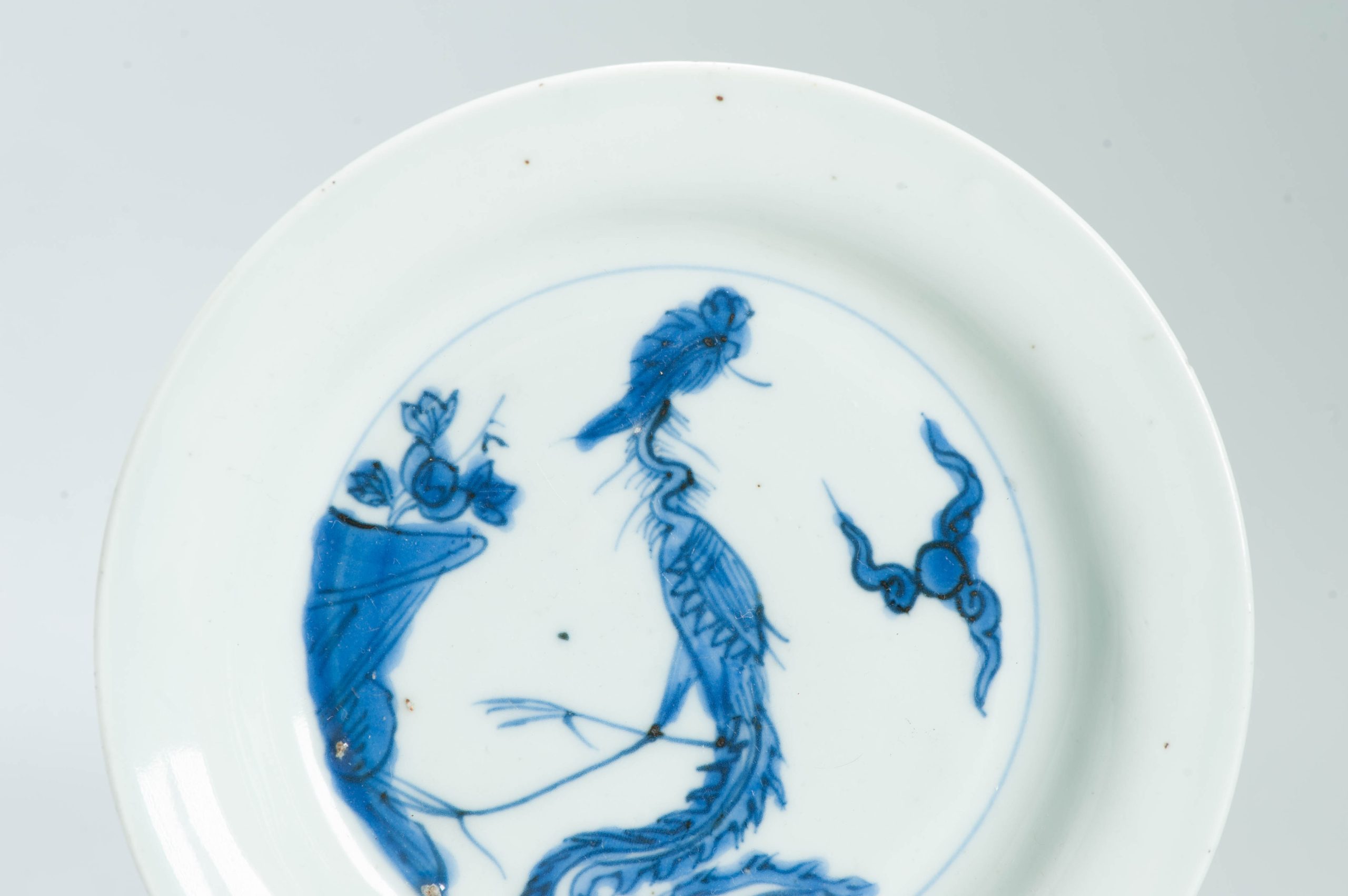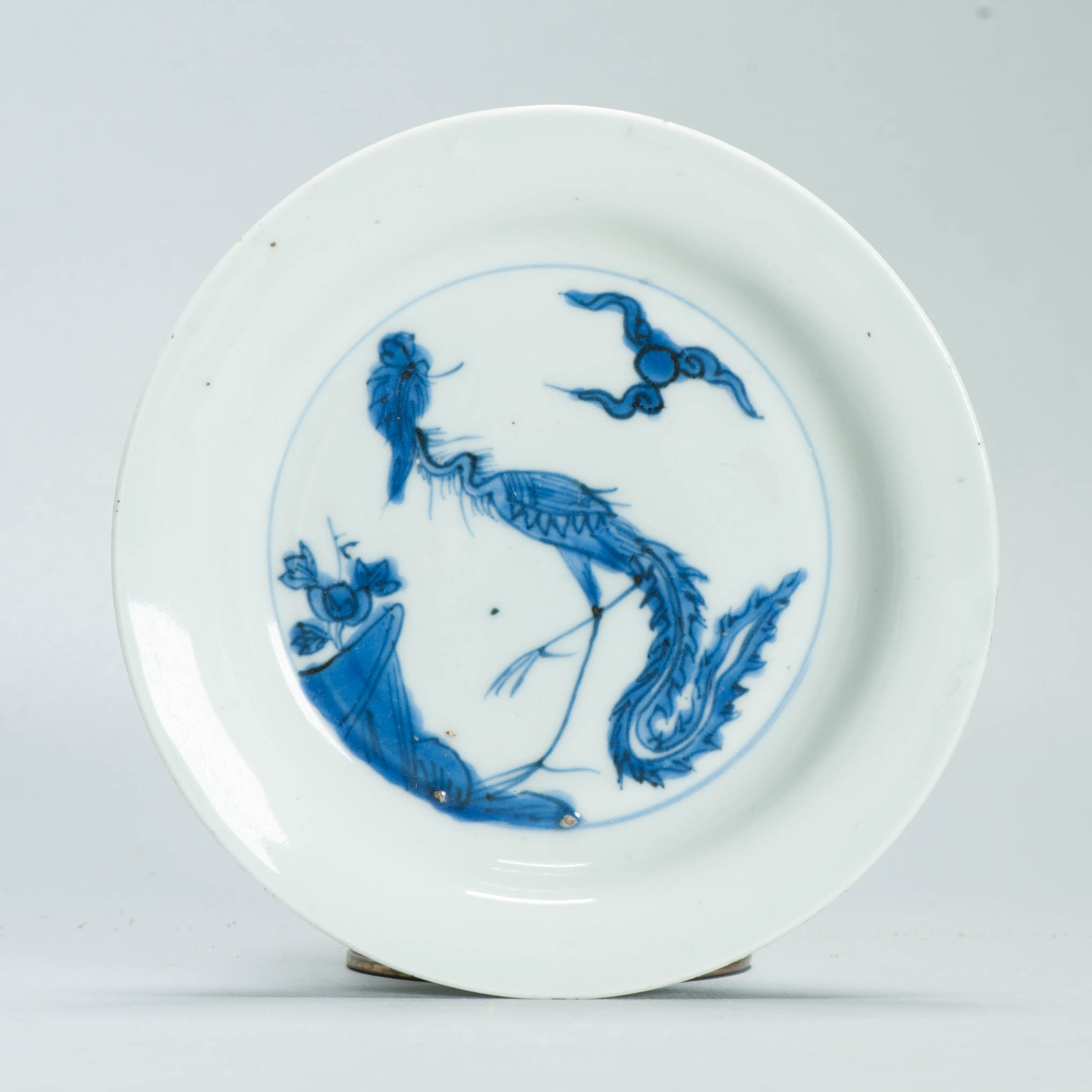 Small dish on footring, wide flat rim. Decorated in underglaze blue with a striding phoenix in schematically rendered landscape with a cloud motif. The sides and rim are undecorated. On the base a mark in seal script, possibly shou (long life)