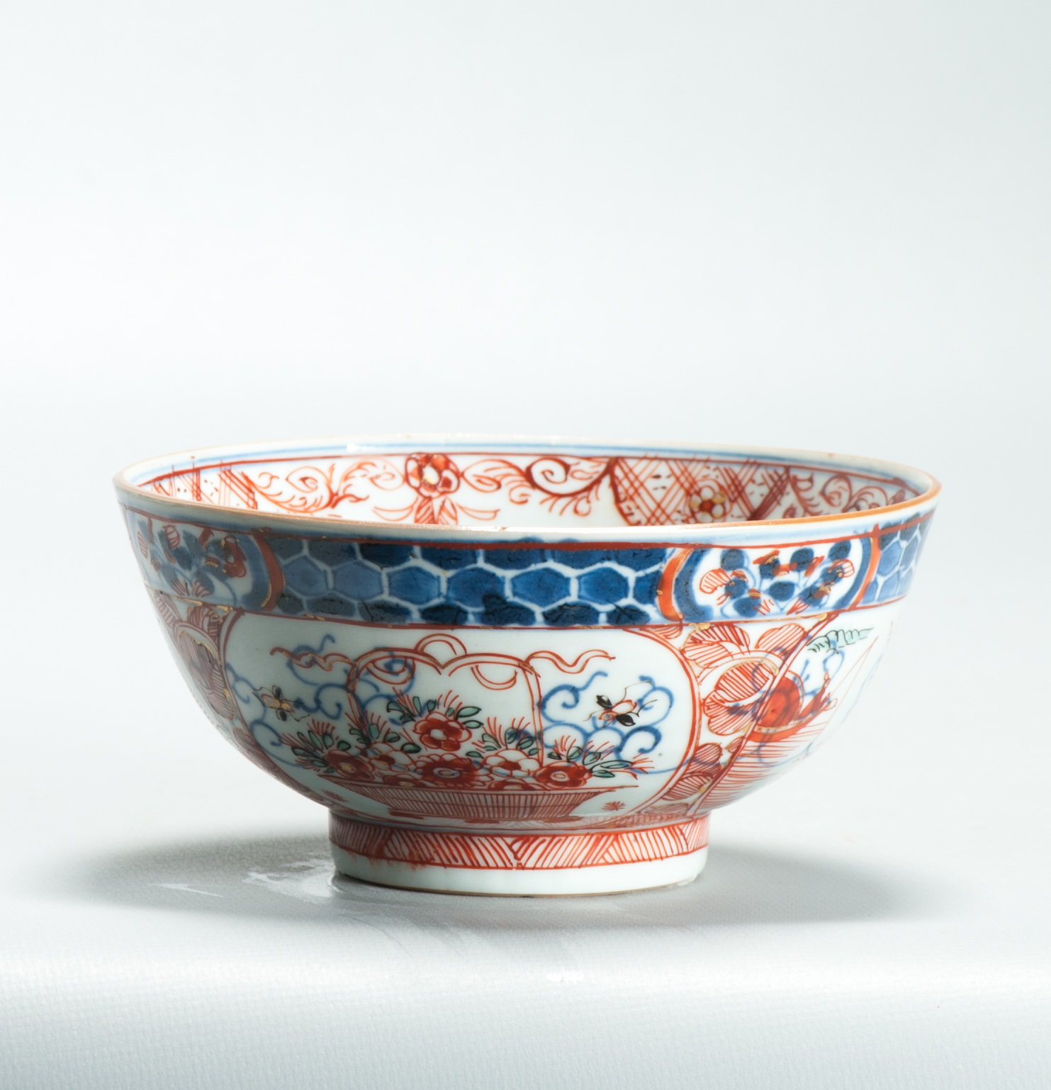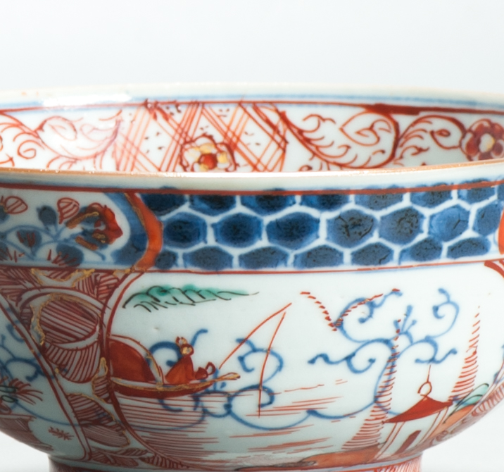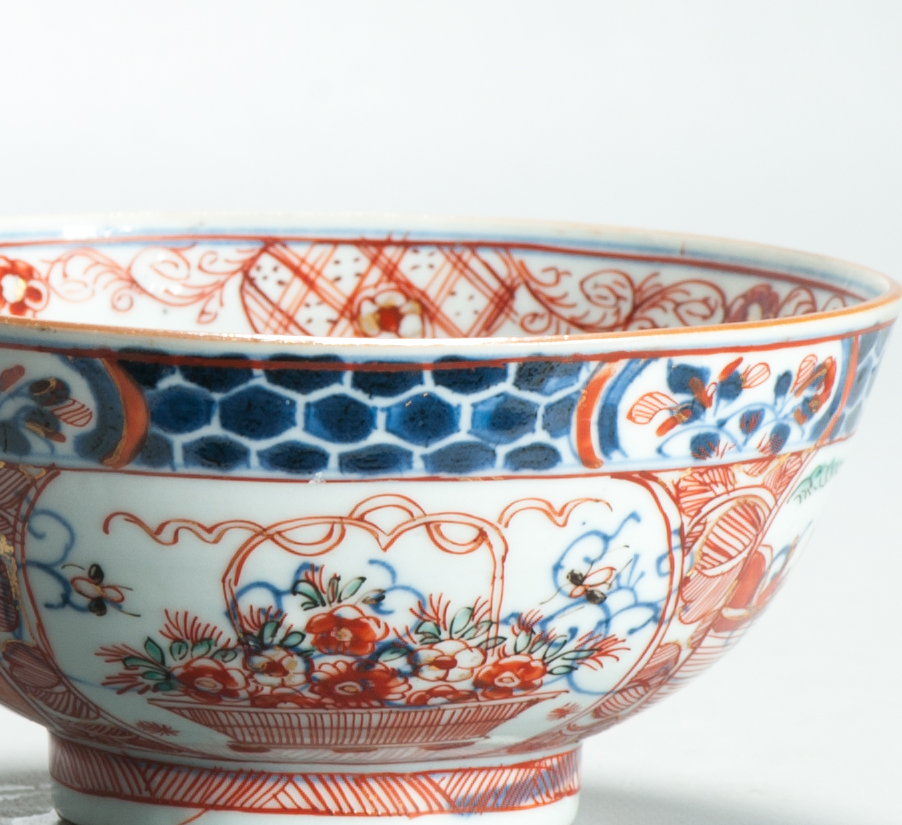 This enhancemend was done on “petit feux” or small fire at a lower temperature. This technique of baking enamels on a lower temperature that was perfected in the Delft around 1670-1680 to compete with the colourfull Japanese porcelain of the time. At the turn of the 17th c Chinese porcelain was cheaper than its Japanese counterpart and by overglazing Chinese porcelain with red it was easy for the Dutch to create a `Imari` feel on the Chinese wares. Catering to the huge craving for imari coloured porcelain in the West at the time. At that time blue _ white porcelain was relatively well known as was blue and white delftware. It was the addition of different colours that sparked huge interest. Everybody wanted porcelain with red in it, and that was what the merchants were giving their customers with this Amsterdam Bont decorations. One must imagine that sometimes a VOC ship brought home hundreds of thousands of pieces of porcelain, often with 1000’s of pieces decorated in the same way (See for example the Geldermalsen or “Nanking” Cargo) . So a simple blue and white bowl could easily be increased in value by enhancing its looks.