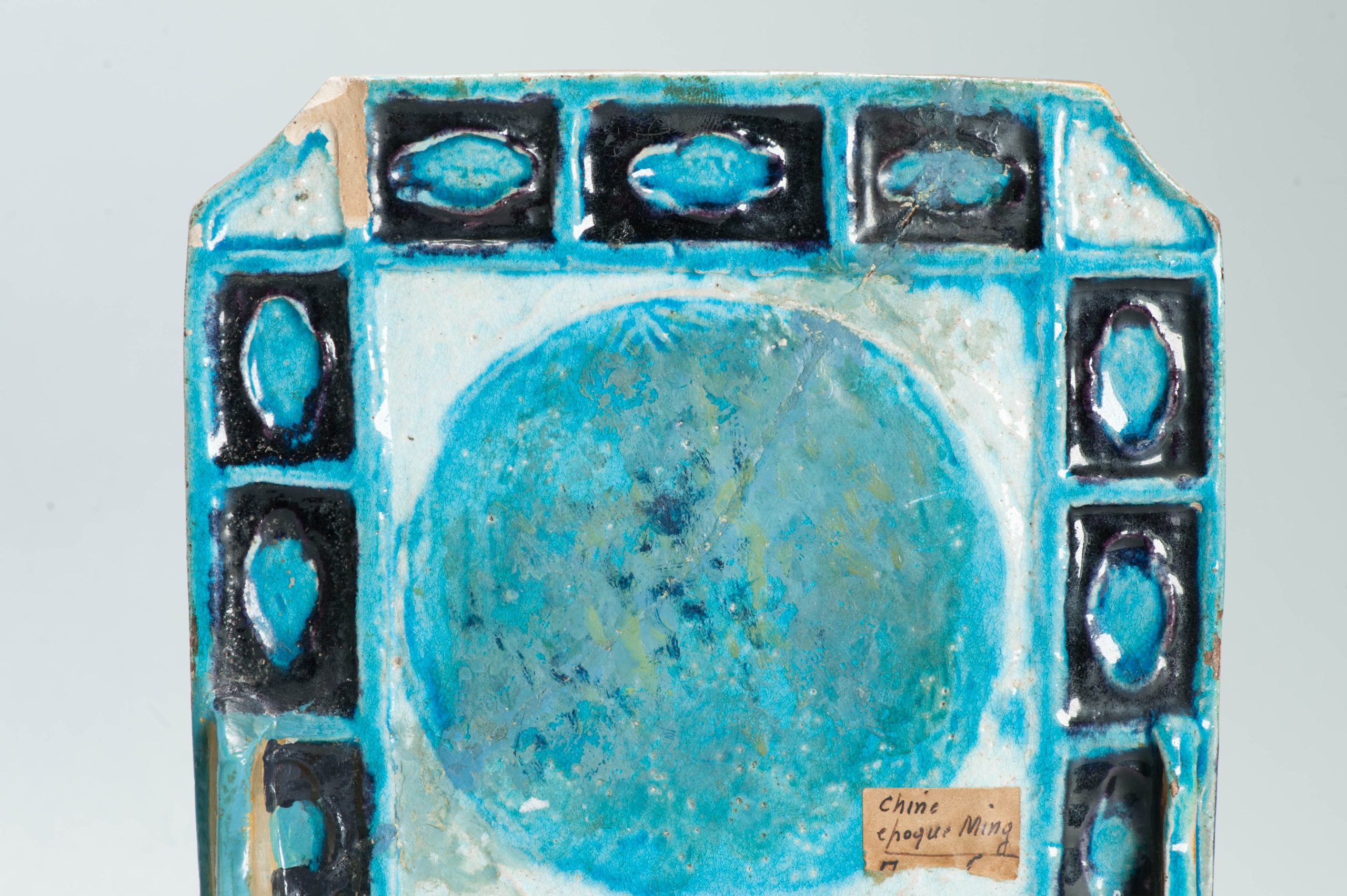This piece is considered part of the Fahua pottery family. Fahua Ware is Either Pottery or Stoneware with a Low Fired Vitreous Glaze often with the Highly Fluxed Colours Seperated by Thin Walls of Clay in the Manner of Cloisonne.
