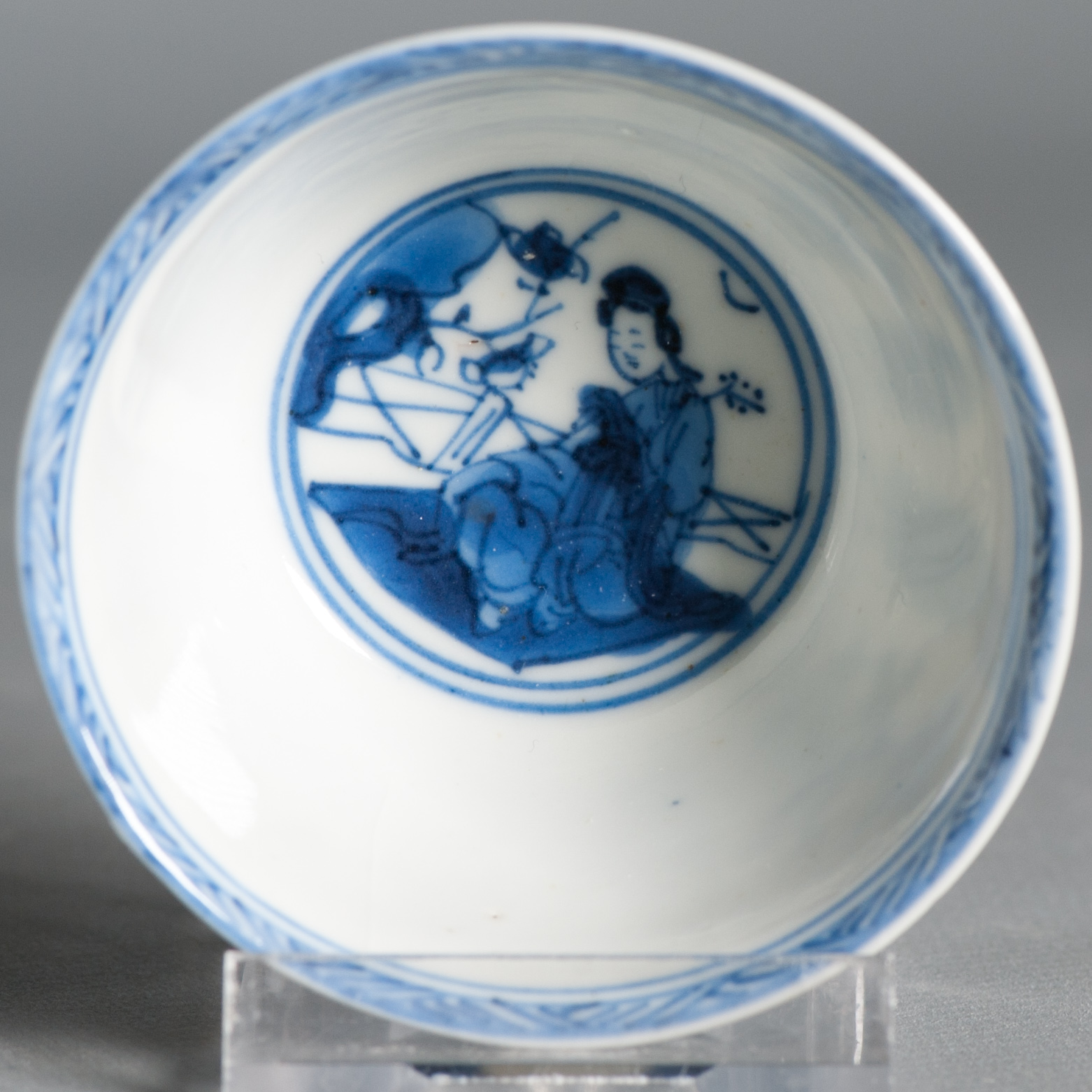 Kangxi period piece in underglaze blue. Visible is a of elegant ladies on the outside and inside.
