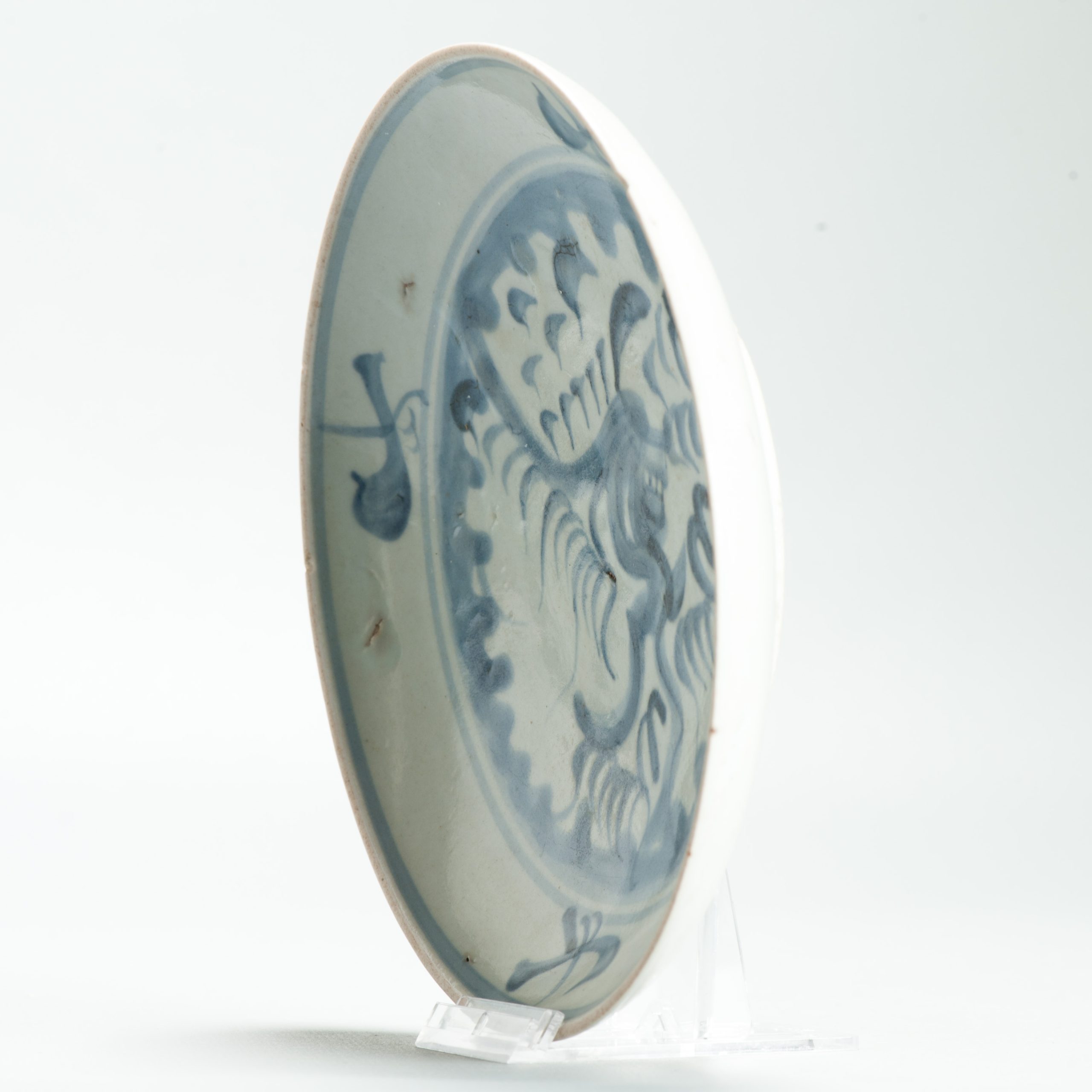 Sharing with you this fantastic small dish from the Dehua kilns with a delicate blue and white saucer dish, painted in the centre with a stylised Phoenix bird within a band of waves. The cavetto is decorated with different stylised flower sprays.
