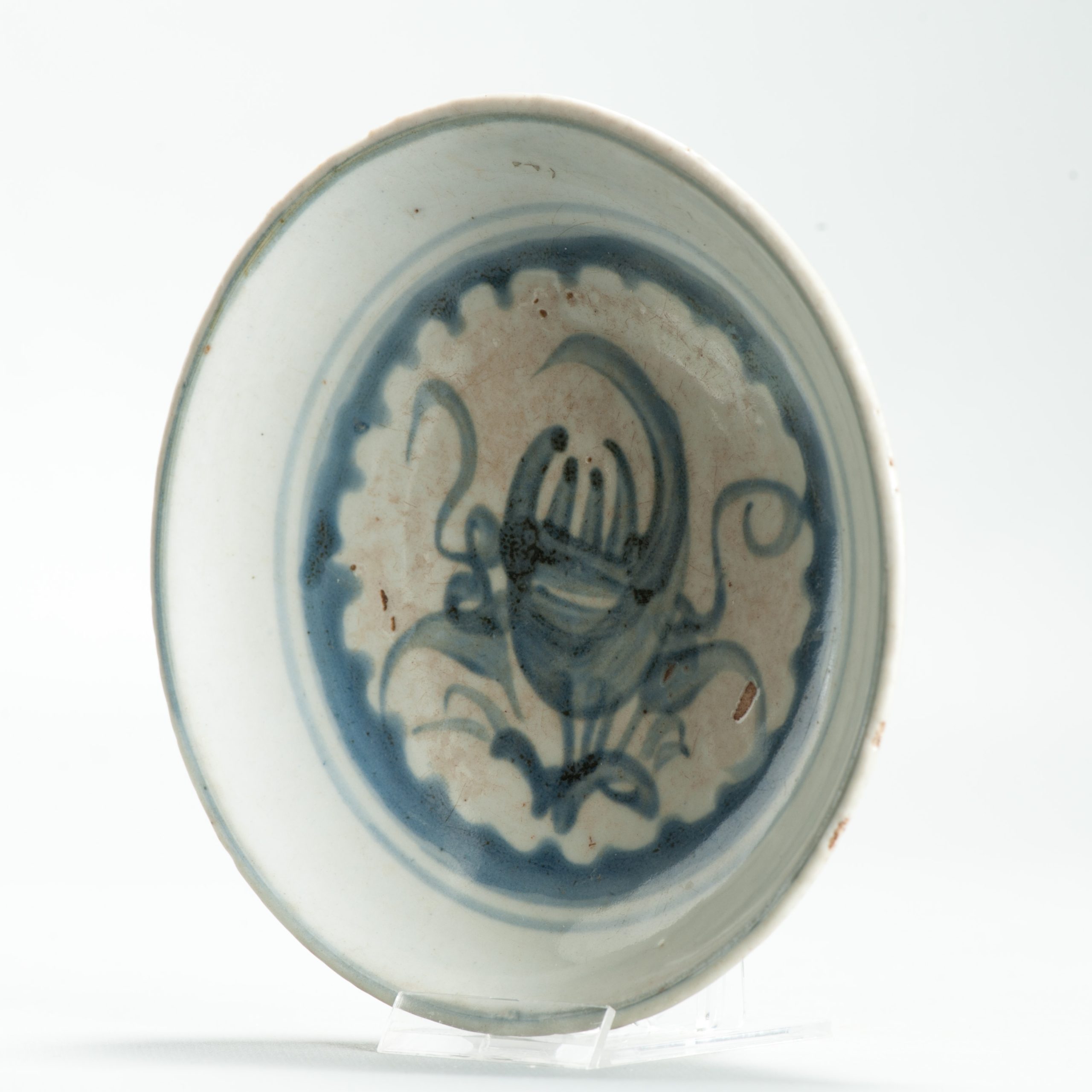 Similar dishes can be found in the inventory of the ‘Witte Leeuw’ shipwreck from the 17th century but others date them as 18/19th century because they can also be found in the Tek Sing cargo.
